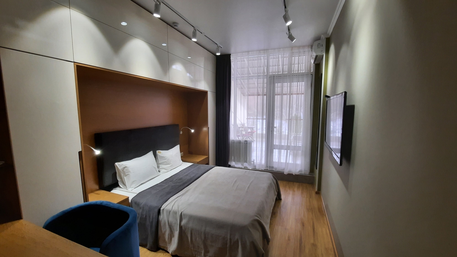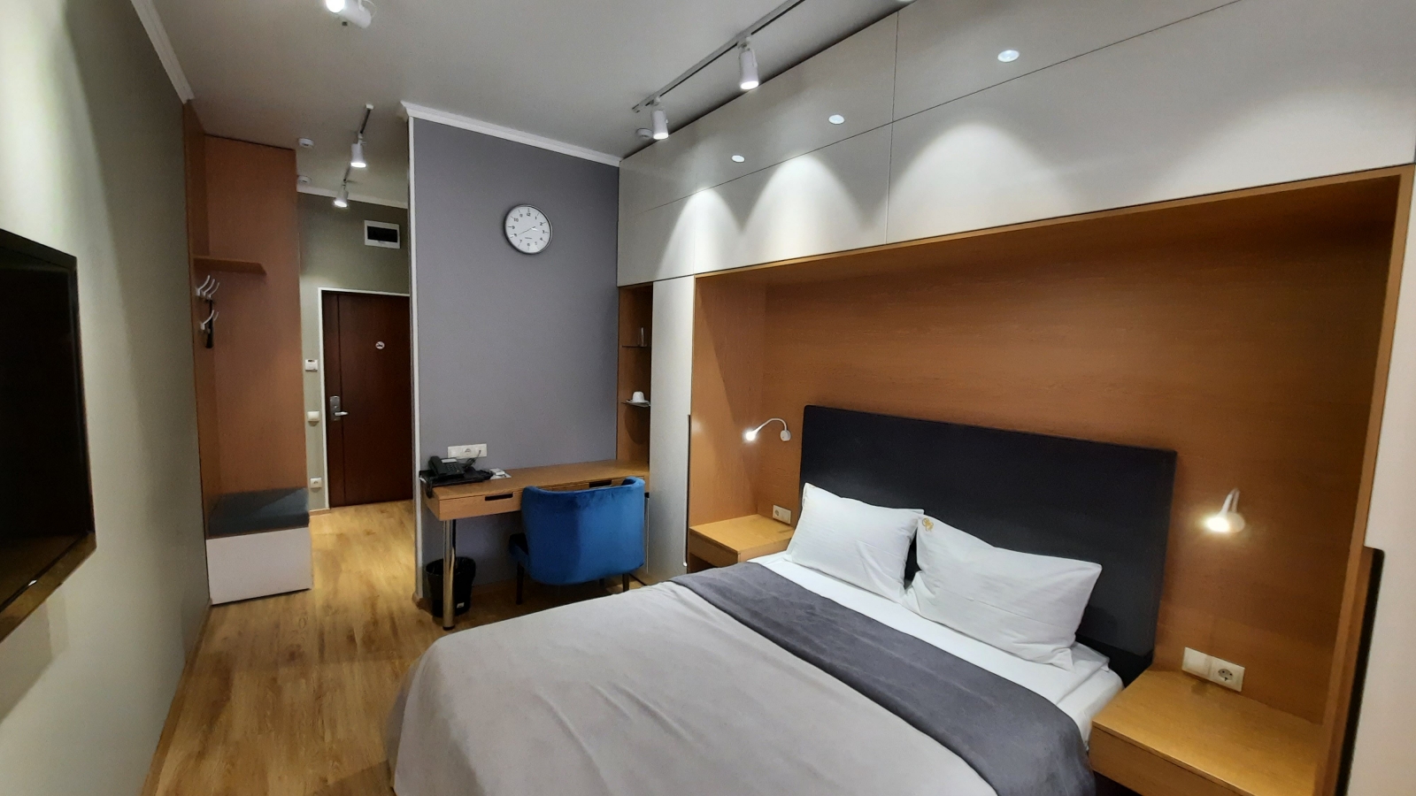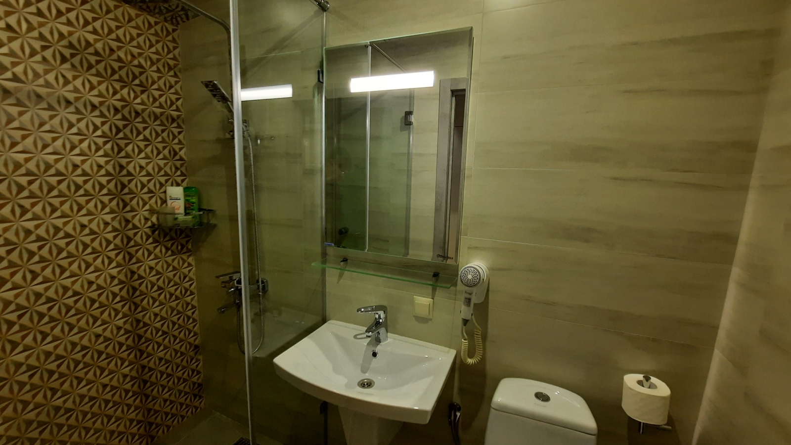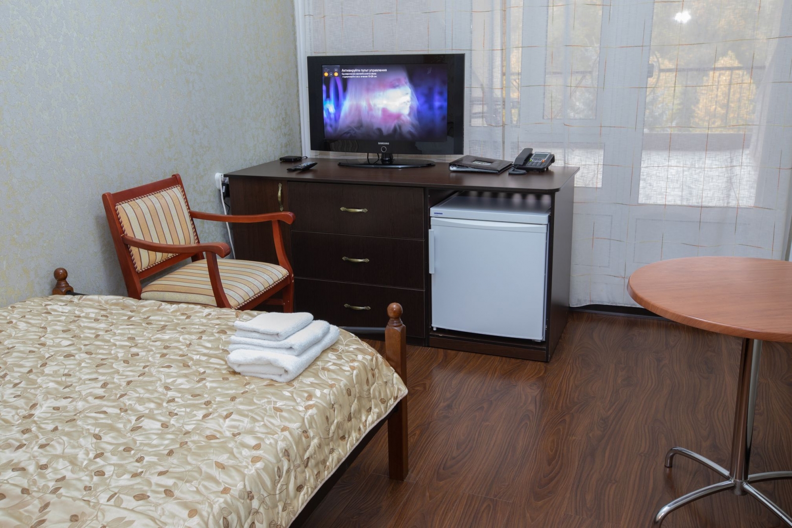 Площадь номера - 16 кв.м. 1 осн. место. 1 доп. место. Балкон. Мебель: вешалка, зеркало, кровать полутороспальная, прикроватная тумбочка, стол, стул, шкаф. Оборудование: кондиционер, сейф, телевизор, телефон, холодильник, чайный набор посуды. Санузел: с душевой кабиной, тапочки, туалетные принадлежности, фен, халат. Сервис: Wi-Fi бесплатно, смена полотенец (1 раз в 5 дней), смена постельного белья (1 раз в 5 дней), уборка номера (1 раз в день), услуги внутренней телефонной связи.