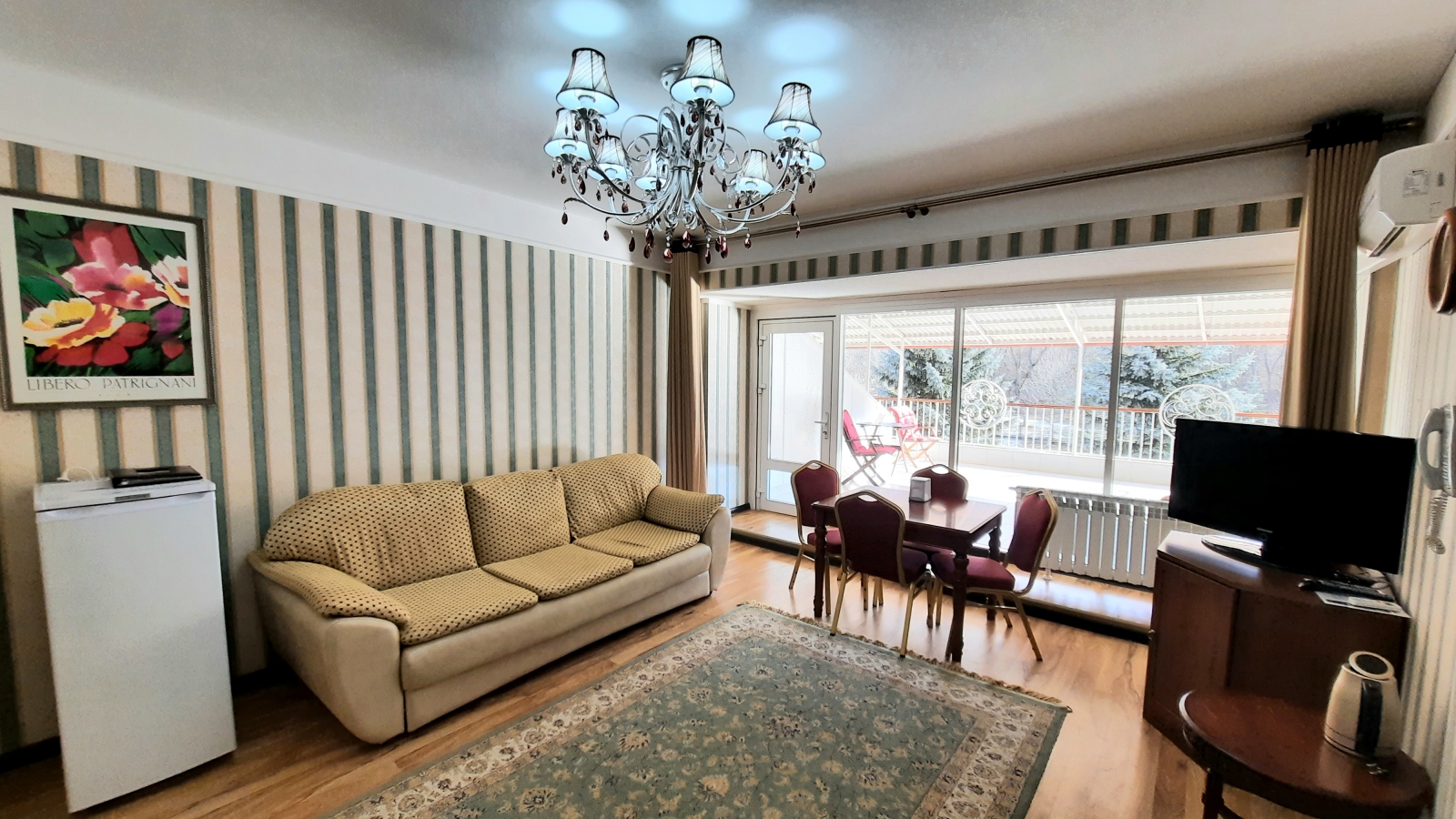 Площадь номера - 35 кв.м. 2 осн. места. 1 доп. место. Мебель: вешалка, диван, зеркало, кровать двуспальная, набор мягкой мебели, прикроватные тумбочки, стол, столик журнальный, стулья, тумба под телевизор, шкаф. Оборудование: кондиционер, набор посуды, сейф, телевизор ЖК, телефон, холодильник, чайный набор посуды. Санузел: с ванной, тапочки, туалетные принадлежности, фен, халат. Сервис: Wi-Fi бесплатно, смена полотенец (1 раз в 5 дней), смена постельного белья (1 раз в 5 дней), уборка номера (1 раз в день), услуги внутренней телефонной связи. Терраса.